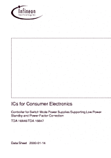 TDA 16846 Q67000-A9377 P-DIP-14-3 TDA 16846G Q67006-A9430 P-DSO-14-3 TDA 16846-2 Q67040-S4494 P-DIP-14-3 TDA 16846-2G Q67040-S4495 P-DSO-14-3 Выход этой ИС (вывод 13) предназначен для управления мощным МДП-транзистором, для которого характерна большая емкость цепи затвора (до нескольких тысяч пФ.). Особенностью ИС TDA16846 является малый ток потребления перед включением по выводу питания (вывод 2) – около 0,1 мА, что позволяет осуществлять ее запуск от маломощной цепи.
